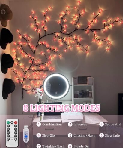 48 LED Cherry Blossom Tree Branch Lights for Wall,Cherry Blossom Lights with Remote,Timer,8 Lighting Modes,Flexible Willow Vine Twig Fairy Light,Floral Wall Decor for Bedroom Home,Spring Decor